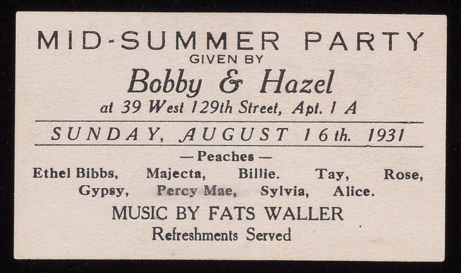The average entry fee for a rent party was 25 cents with food and drinks for an additional cost. When the parties started during prohibition they often served bootleg liquor and they were a great place to get Southern comfort food like fried chicken, pigs feet, fried fish, and potato salad. The parties were advertised with ‘rent party tickets’ small business cards or fliers that were handed out to friends or to anyone on the street. Music and dancing were a big part of the gatherings. The hosts would hire a piano player or a small combo (piano, drums, saxophone). Some of the well-known musicians who got their start playing piano at rent parties include Fats Waller and James P Johnson (whose hit song started the Charleston craze). Rent parties are said to have been the birthplace of stride piano. Some sources claim that most dances of the jazz era got their start at rent parties before being refined in dance halls. Frankie Manning and Norma Miller both talk about dancing at rent parties as children.